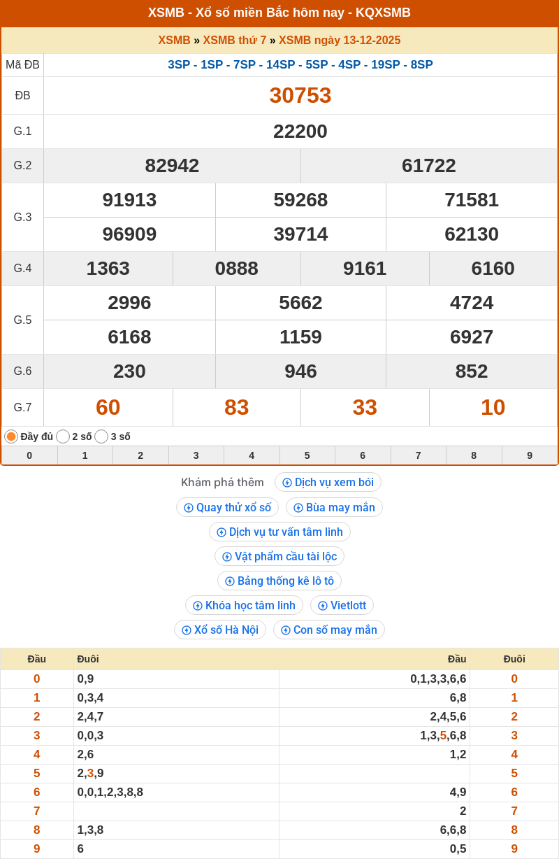 1. ✔️Nhìn lại kết quả xổ số miền Bắc ngày 13/12/2025 hôm qua