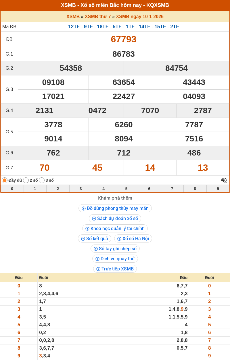 1. ✔️Xem lại kết quả xổ số miền Bắc ngày 10/01/2026 hôm qua